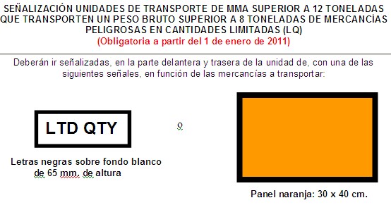 El ADR 2009 mantiene la filosofía para acogerse a la exención para el transporte de mercancías peligrosas embaladas en cantidades limitadas, que viene determinada fundamentalmente por la LQ asignada a la mercancía peligrosa en cuestión y por el peso total del bulto y la capacidad de cada envase interior. No obstante, establece que, a partir del 1 de enero de 2011, los expedidores informarán de la masa bruta total de mercancías a transportar LQ, antes de un transporte y que las unidades de transporte de mercancías peligrosas en cantidades limitadas deberán señalizarse si: